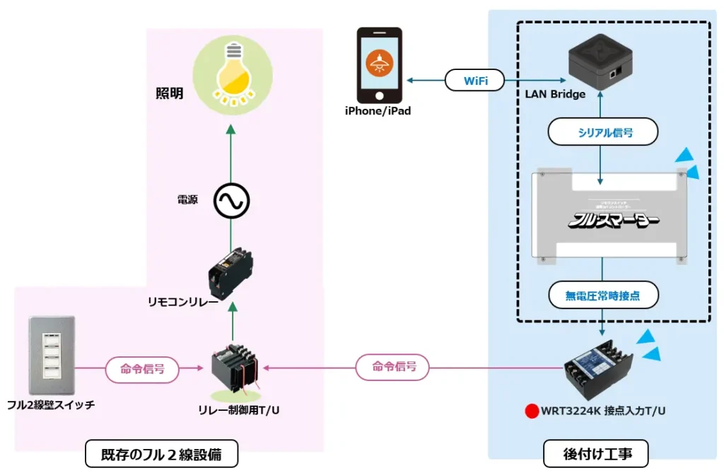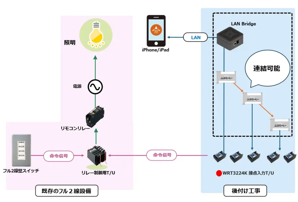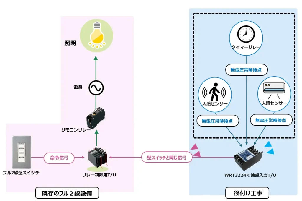 このWRT3224K 接点入力T/Uは、『無電圧の常時A接点(=電圧を出さない短絡信号)』を受けることで、フル2線の壁スイッチとの併用を実現する装置です。