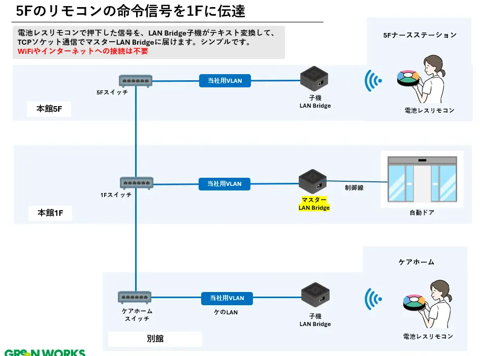 結論を言いますと、電波は届けることができません。建物同士接続されている「院内LAN」に乗せて、電池レスリモコンの「押した時の命令信号」を運んでしまいます。